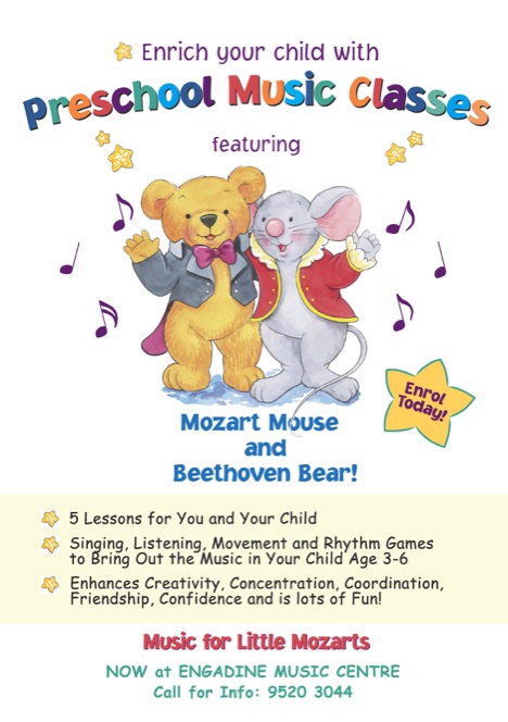 This fun and enriching course centres on the adventures of 2 musical friends, Mozart Mouse and Beethoven Bear, as they learn about music. Topics covered are high and low sounds, steady beat, note values and the beginning of learning to read music.